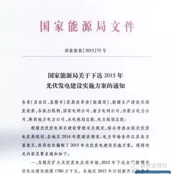 消息:2015年3月16日,國家能源局關(guān)于下達2015年光伏發(fā)電建設(shè)實施方案的通知,既國能新能【2015】73號文件。通知稱2015年我國光伏建設(shè)指標為17.8GW。創(chuàng)歷史新高。