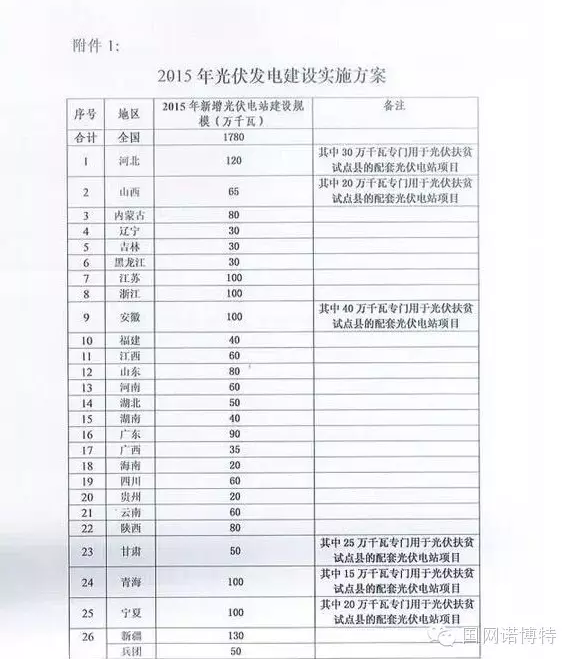 國家能源局關(guān)于下達2015年光伏發(fā)電建設(shè)實施方案的通知